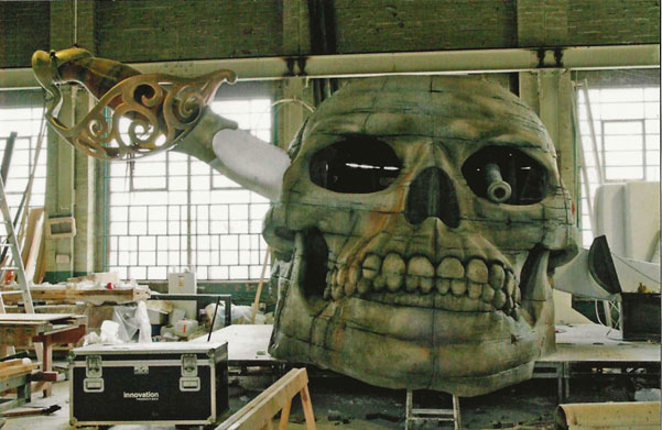 Giant Skull for pool-side show cruise ship, Chris Kelly sculpted skull I molded it and fiber-glassed it.