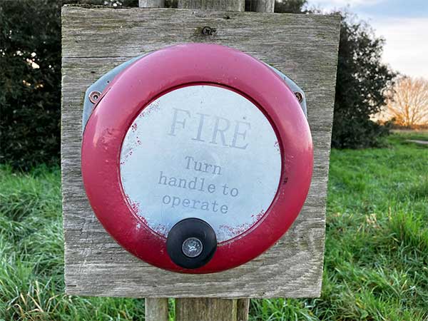 A small fire had started in rough grass at the top of the cliff, probably caused by a discarded cigarette end. We decided to raise the alarm but both of us had left our phones at home, and no one else was in sight. Nearby was a square red sign saying FIRE, and beneath the sign, fixed to the same vertical post, a round red box about the size of a cake tin with a small knob attached to the lid. Faded lettering said ’In case of fire turn handle’, with a curved arrow showing a clockwise direction. It looked like something made by a child.