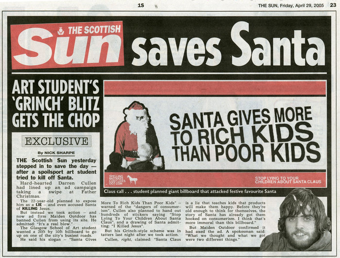 No christmas update from me would be complete without dragging this old thing out of the vault. It was the first billboard I ever designed and the first and last time I ever asked for permission. My first attempt at installing it was cancelled when The Sun found out and called the billboard company, but they ran a story about the work anyway (see right). Good job they stopped me getting my evil message out there by printing it full colour in the newspaper.