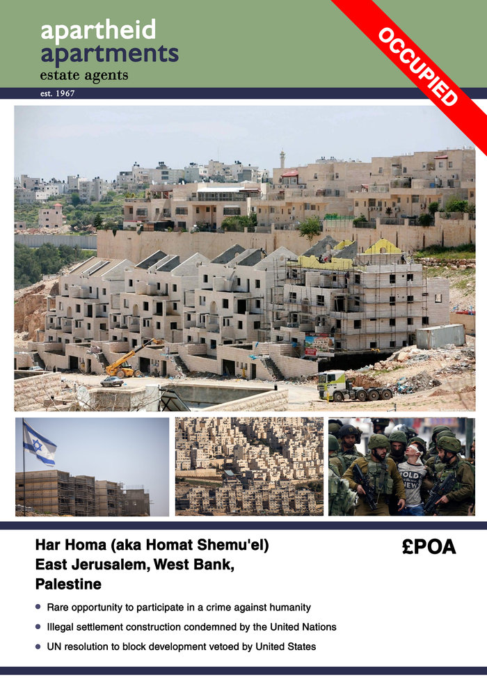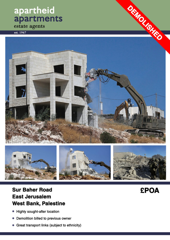 Israel’s genocide in Gaza is beyond horrifying but its important to place it in the context of an ongoing attempt by Israel to wipe Palestinians off the map. I put all these horrific crimes into the mundane form of an estate agent to try and show the banality of evil at work, how things as dull as planning permission and property rights are all part of an attempt to systematically eradicate an entire people.