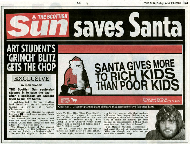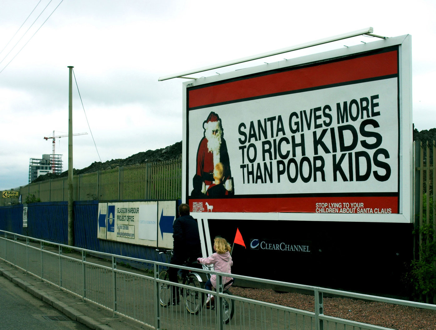 Back in 2005 I tried to, legitimately with permission, put up a billboard that said “Santa Gives More to Rich Kids Than Poor Kids”. When The Sun found out they contacted the billboard company and got it cancelled. This was before ‘cancel culture’ was a thing you see. But fair play to them, they did stop me from getting my evil message into the world by printing it full-colour on half a page of a national newspaper. Jokes on me.