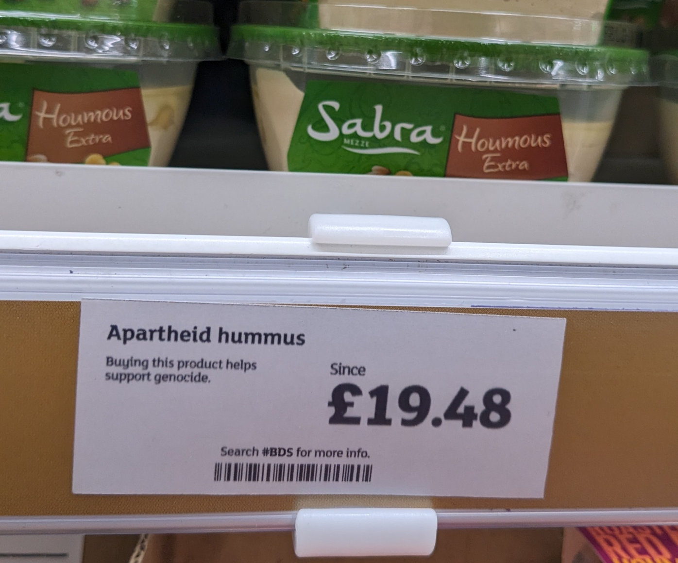 Anti-apartheid supermarket price tags for products covered by the BDS boycott (Boycott Divestment and Sanctions). These are Sainsbury’s (and currently Sabra) specific but I plan to make them for other supermarkets and products over the weekend and they’ll all be available to download and print from my website here.