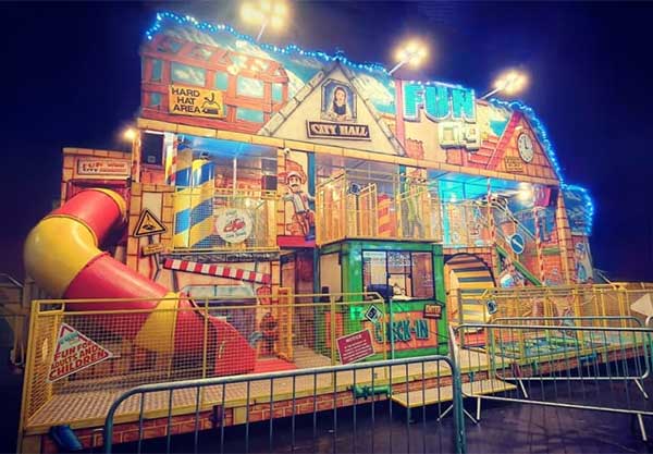 the town hall like a fun house on a pier,