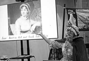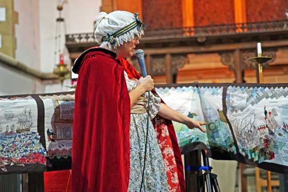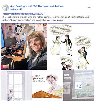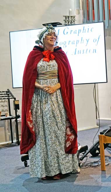 ‘Wow, what a show!!!’ Last night, ‘Cartoon Kate’ Evans created a stunning, funny, informative and intellectually and politically challenging presentation at St Mary’s Church as part of the Todmorden Book Festival. A substantial crowd of people came to see her show – part of her tour to support her new book, ‘Patchwork’, which is a cartoon biography of Jane Austen. It offered a vivid portrayal of history – of the life of women at the time of Jane Austen set against the backdrop of the Empire and colonialism.