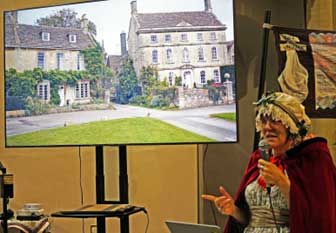 As a bit of background, Kate Evans was born in Montreal, Canada, and raised in Surrey, England. In her show, she explained that she spent a lot of her childhood at her grandmother’s house in the picturesque, Biddestone in Wiltshire (on left in the pic), and used the upstairs window as a model image for Jane Austen’s backdrop for her sewing.