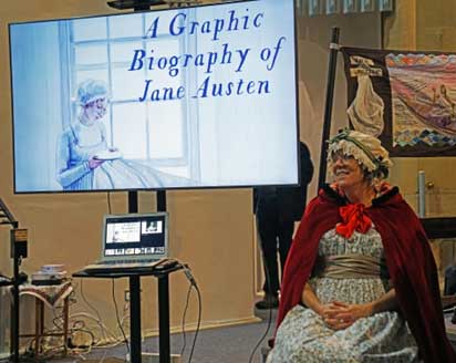 During the show, Kate explained her detailed research methods for her book. She read all the available letters from Jane Austen, read all her books and ended up with over 500 pages of her own research notes. She told us that as a graphic novelist she ‘deconstructs’ the themes running through her subject’s life. Jane’s life was like a ‘swallow trapped in a cage’… ‘Privileged, but she wasn’t free.’
