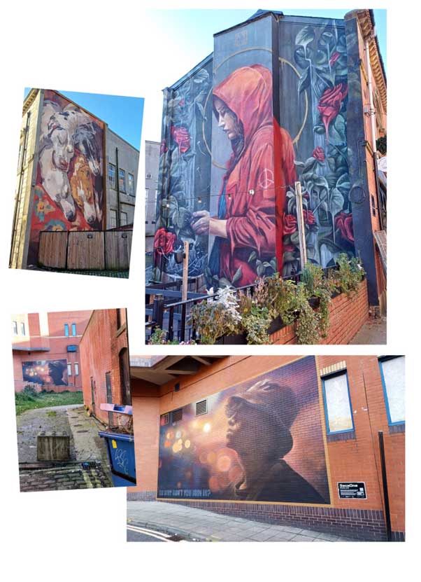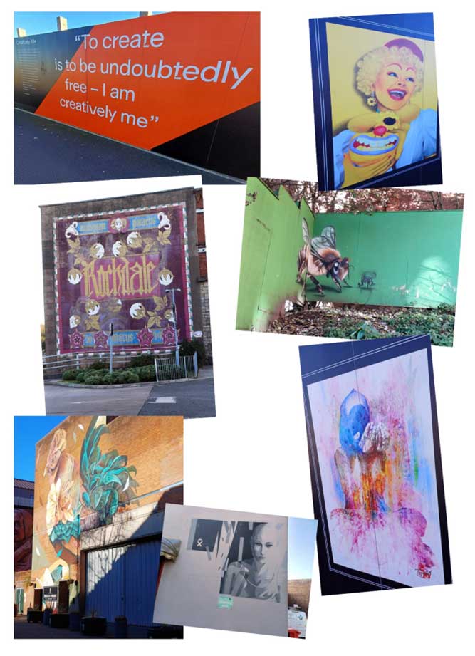 There are still examples of earlier street art which saw world-class artists create large-scale murals around the town in the 2019 Rochdale Uprising Festival which were crafted by artists such as Nomad Clan, Tankpetrol and Curtis Hylton. Each one was inspired by a sense of the place and heritage of Rochdale. Some are now beginning to decay, but it kind of adds to the patina. The new murals have helped to create a new sense of civic pride, but are also vibrant and help to create a new town-scape. The process of creativity continues.