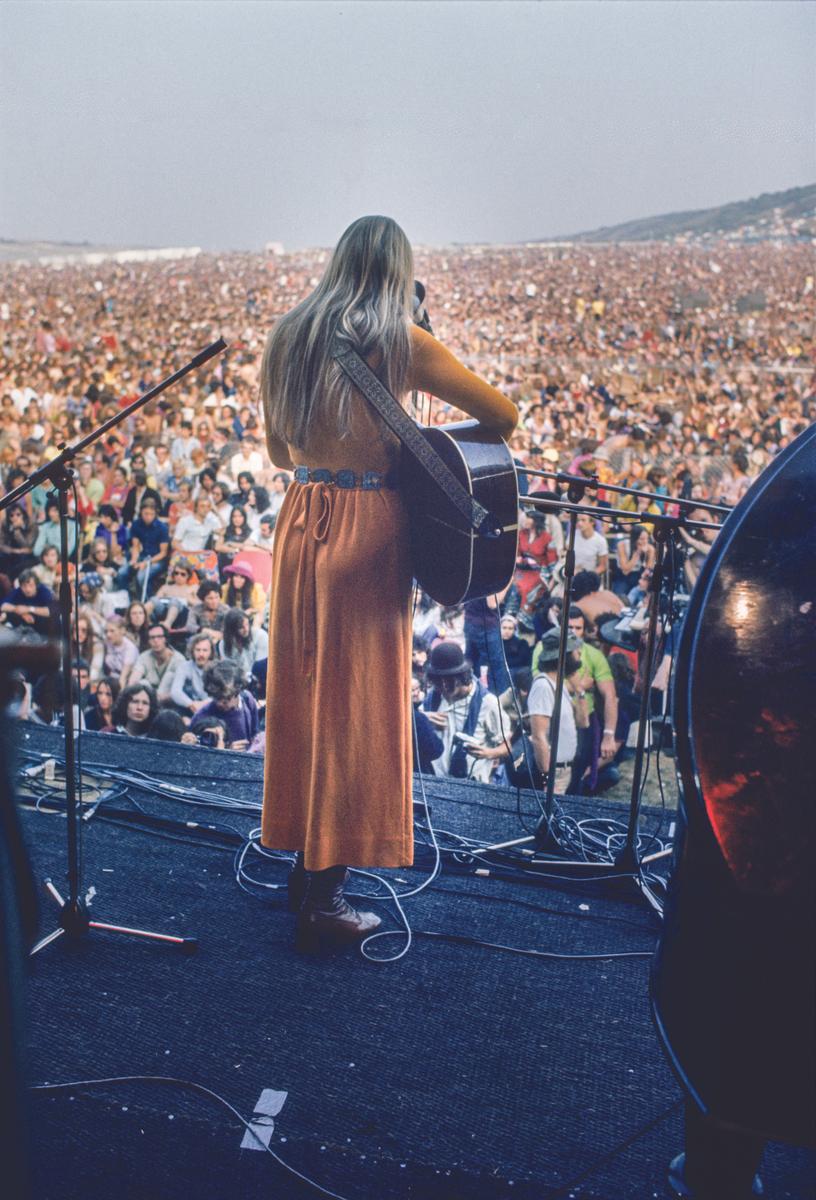 As the festival’s history has been gradually rewritten, Joni Mitchell is the other performer whose appearance has become mired in controversy. Her otherwise superb set was interrupted twice: first when someone collapsed near the front of the stage and required medical attention, and again when an acquaintance of hers stumbled onstage under the mistaken belief that he had permission to join her. The audience immediately in front responded with boos as the intoxicated intruder was removed. Lerner exploited the moment in his film, intercutting a heated backstage argument – audible neither to Mitchell nor to the crowd – with her performance to imply that the incident continued to unsettle her. In reality, the consummate professional returned for two encores, and Melody Maker celebrated her performance on its front page under the headline “Joni’s Triumph.”