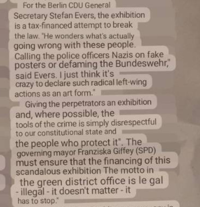 There has also been some strong objections to the pro-Palestine work in the show by myself, Special Patrol Group and Protest Stencil, due to the German left’s bizarre unqualified support for anything Israel does. A phenomena which I think could almost be more fully explored in its own exhibition/psychology experiment.
