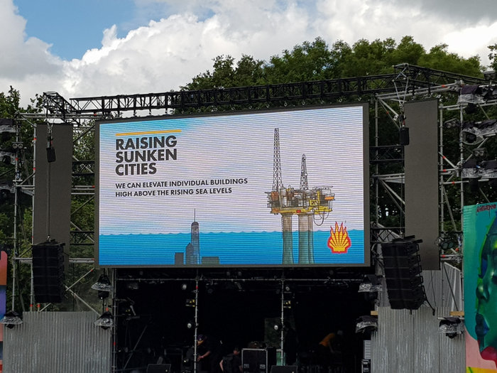 Also included here some photos of some other work I had around the site, an animated Hell video on the Gas Tower stage between bands, a poster of my Everyone is Dead print which someone tastefully altered with a ‘dont buy the sun’ sticker, my ‘Life’s Great/Yours Isn’t” print on sale at @shangrilart, and the train carriage full of subvertisements I installed at Platform 23, the bar in Shangri-La.