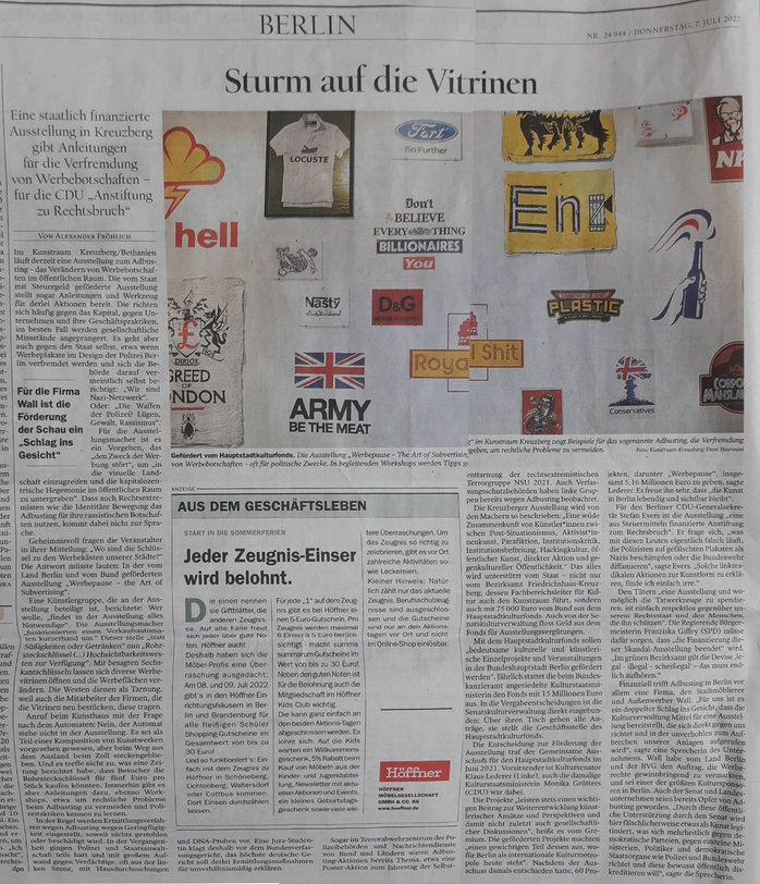 The group exhibition I co-curated in Berlin called Werbepause – The Art of Subvertising (at Kunstraum Kreuzberg until the 21 August) has been generating some controversy in the German press.