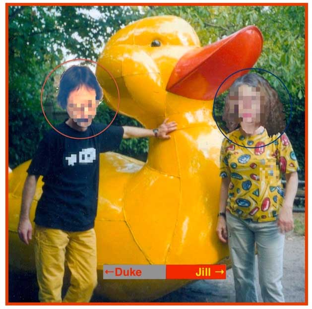 He went to their next door neighbor’s, the one with a decal of a gun aimed at your face that said NEVER MIND BEWARE OF THE DOG. But the guy refused to unlock his locks (police, chain, pad, Medeco & several others) for so trivial a matter. Duke said, “Put some in an envelope and shove it under your door.” But the guy had stopped listening long before.