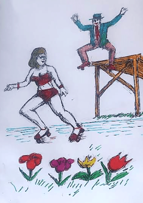 Sam leaps from a diving board behind Sabrina who is roller skating