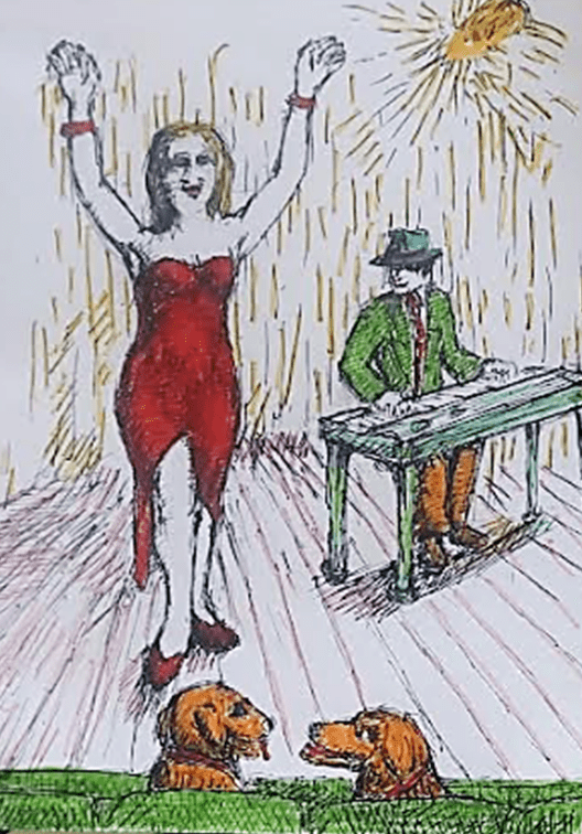 Staffy and Sue look at each other before barking their applause. Dd 70