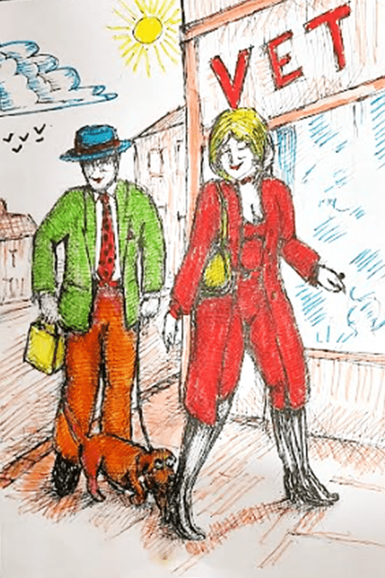 Staffy enjoys going with Sam and Sabrina to the vet.