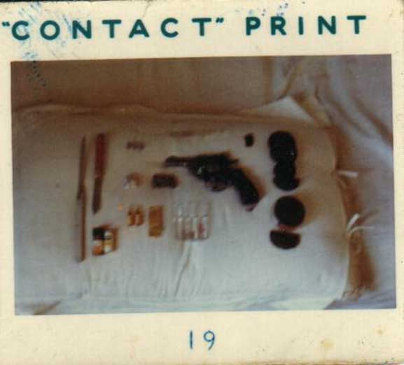 My companion Peter took a picture of my booty laid out on a pillow in Kabul. There’s a syringe along the top, over the revolver. Two folding knives on the left, and various discs of black hashish on the right. There are three bullets for the gun top left and various pills, drugs, etc including two ampoules of morphine and 4 larger ones of distilled water. There is a small lump of opium top right near the larger discs of hash. All of it was used up, disposed of, like the gun that was pinched from me in Kandahar, or brought home with me. This rather poor contact print is the only image left.