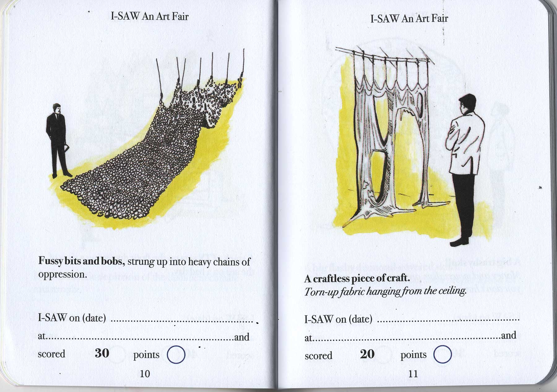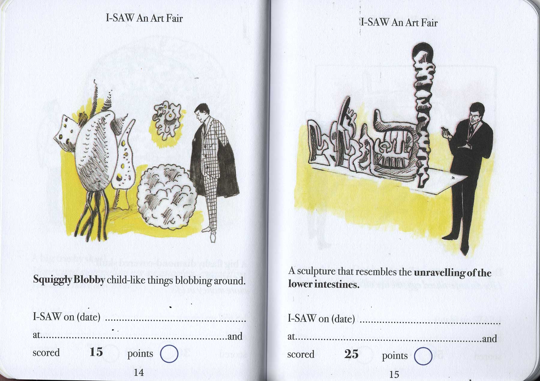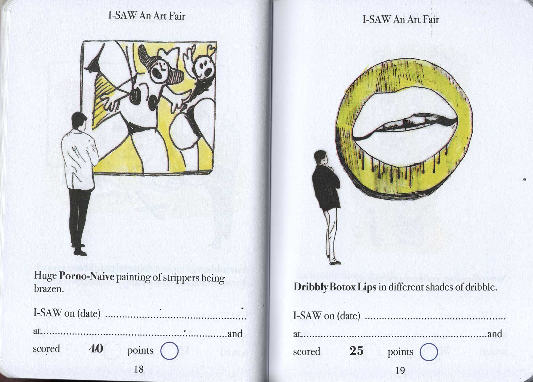 Have you ever been to an art fair? Can you even afford to get into an art fair? Dung Beetle books proudly presents a handy and simple Art-Spotting-Guide. Our fun guide covers everything from mannequins in shopping trolleys to environmental apocalypse. There is so much to see, and with this I-SAW guide you can tick off every cliche you come across. As you spot each of the trends pictured, you earn an I-SAW score for yourself. You’ll find your score will quickly mount up, and when it totals 1,250 points you may award yourself the rank of CULTURALLY AWAKENED. Have fun, and remember to write to M Elia (Big cheif I-SAW) for validation.