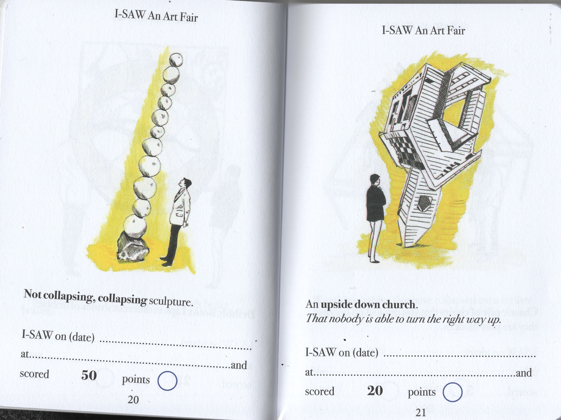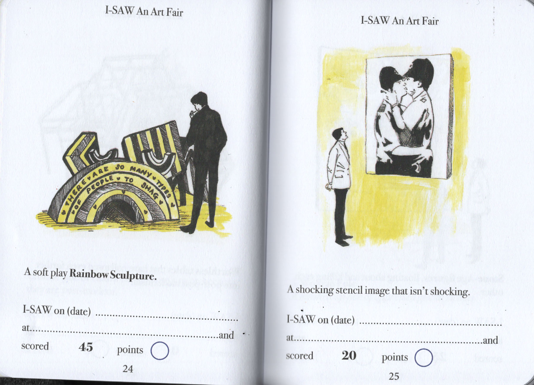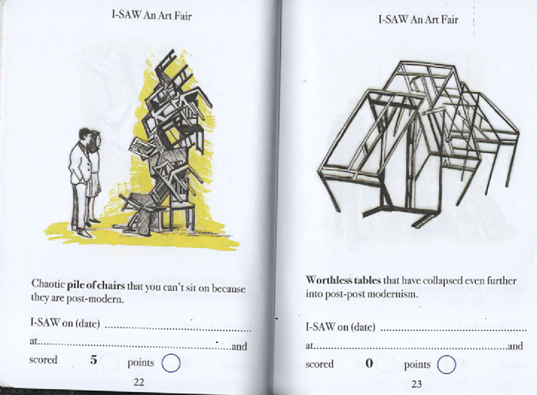 Have you ever been to an art fair? Can you even afford to get into an art fair? Dung Beetle books proudly presents a handy and simple Art-Spotting-Guide. Our fun guide covers everything from mannequins in shopping trolleys to environmental apocalypse. There is so much to see, and with this I-SAW guide you can tick off every cliche you come across. As you spot each of the trends pictured, you earn an I-SAW score for yourself. You’ll find your score will quickly mount up, and when it totals 1,250 points you may award yourself the rank of CULTURALLY AWAKENED. Have fun, and remember to write to M Elia (Big cheif I-SAW) for validation.