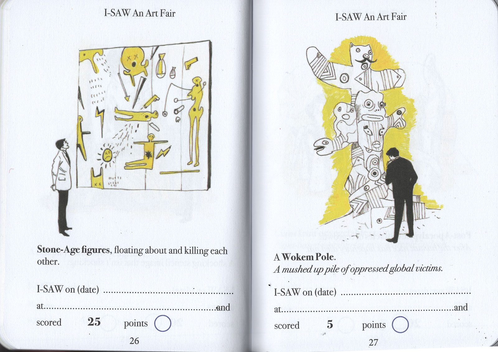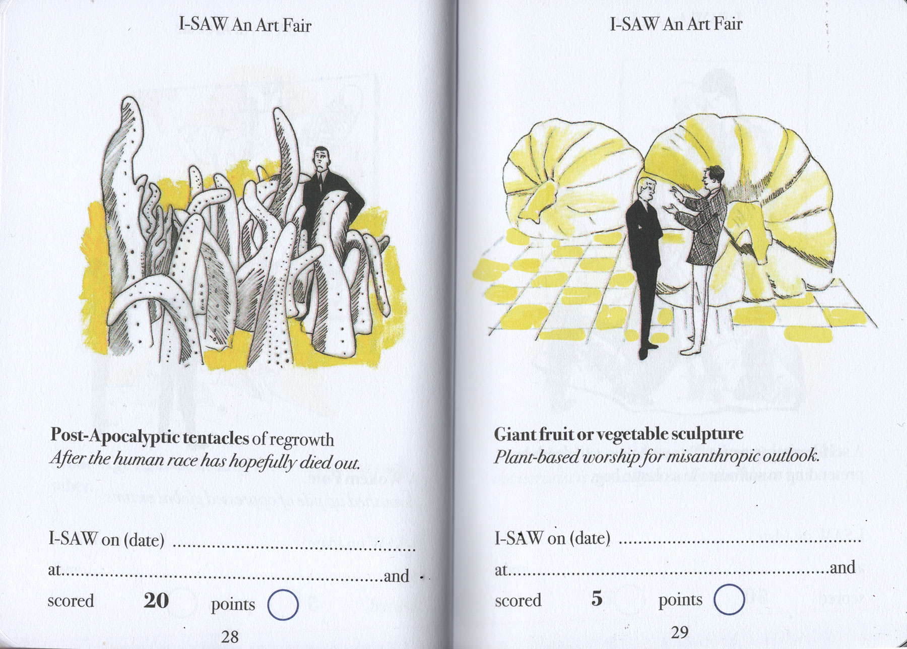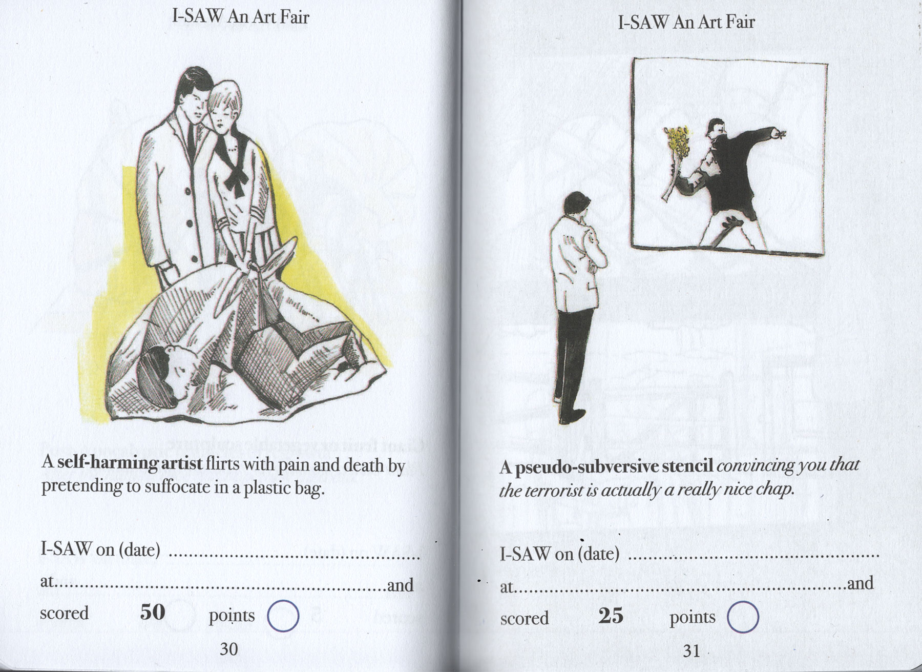Have you ever been to an art fair? Can you even afford to get into an art fair? Dung Beetle books proudly presents a handy and simple Art-Spotting-Guide. Our fun guide covers everything from mannequins in shopping trolleys to environmental apocalypse. There is so much to see, and with this I-SAW guide you can tick off every cliche you come across. As you spot each of the trends pictured, you earn an I-SAW score for yourself. You’ll find your score will quickly mount up, and when it totals 1,250 points you may award yourself the rank of CULTURALLY AWAKENED. Have fun, and remember to write to M Elia (Big cheif I-SAW) for validation.