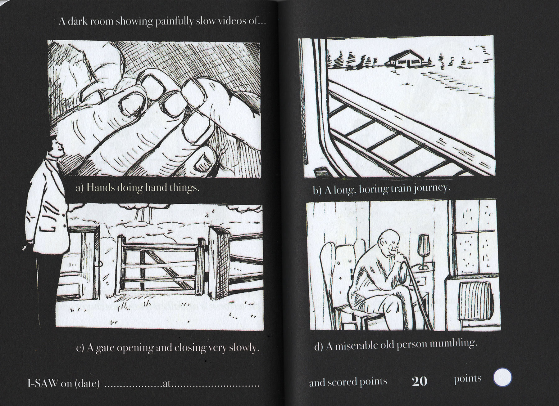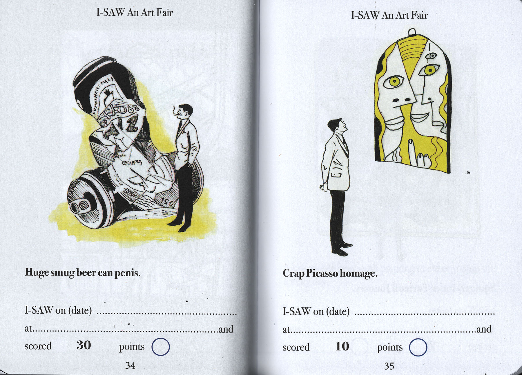 Have you ever been to an art fair? Can you even afford to get into an art fair? Dung Beetle books proudly presents a handy and simple Art-Spotting-Guide. Our fun guide covers everything from mannequins in shopping trolleys to environmental apocalypse. There is so much to see, and with this I-SAW guide you can tick off every cliche you come across. As you spot each of the trends pictured, you earn an I-SAW score for yourself. You’ll find your score will quickly mount up, and when it totals 1,250 points you may award yourself the rank of CULTURALLY AWAKENED. Have fun, and remember to write to M Elia (Big cheif I-SAW) for validation.