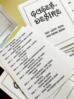 The artists and writers James curated for 020 Desk Zero, Gates of Desire, are all creators he deeply admires. It was the perfect way to interact with them and learn more about their work. The gallery facilitates an intimate space in which to hear works lasting between 30 seconds and 30 minutes long.  Each contributor received a limited edition cassette of the collection, available only to them. Although there are connotations between phone numbers on cards and illicit sex, not the case here, powerful themes of desire, fragility and longing are present nonetheless.