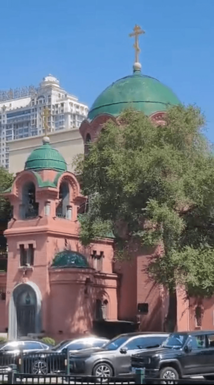 23rd July 2025, Ma Yongbo is back in Harbin, for a while, where he grew up, walking along a street past the green minarets of the local Churches. There are many churches on the same street. He sends his WhatsApp footage to Helen Pletts