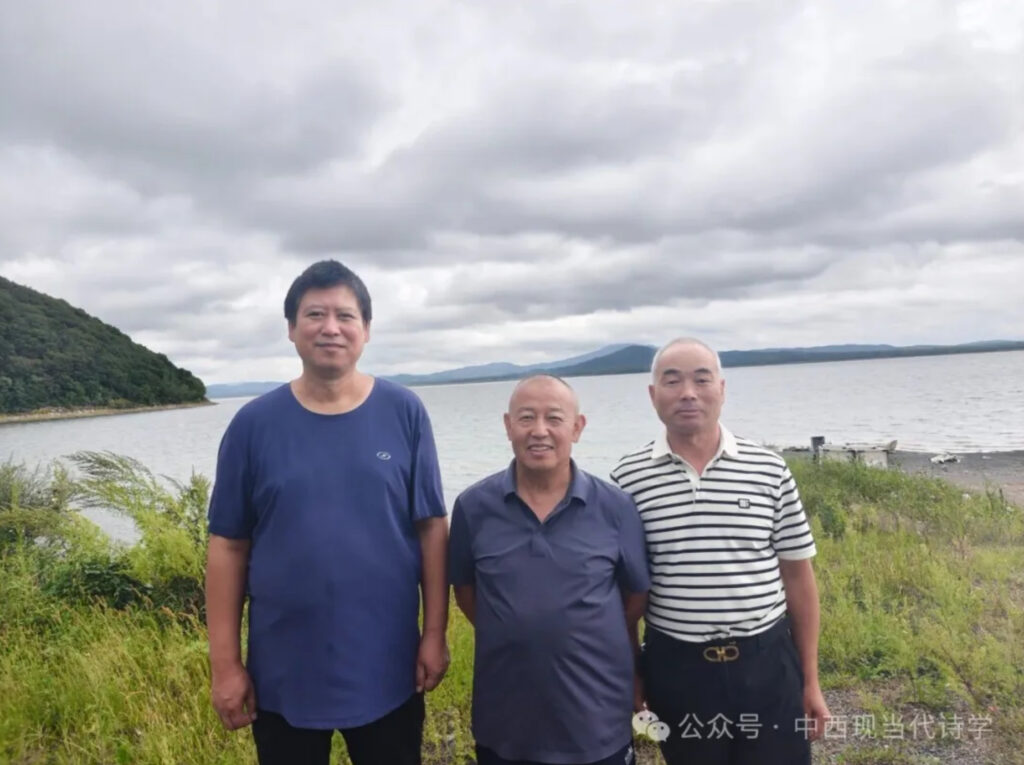 Photograph: Three poets visit Cap Mountain, Ma Yongbo 马永波, Yuanzheng 元正 and Aihui 爱辉