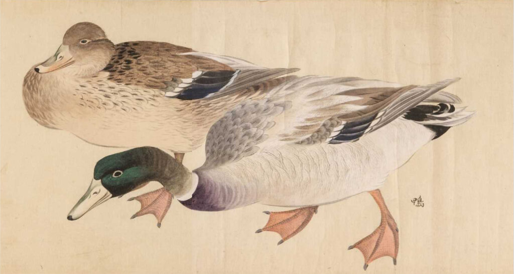 Painting: Detail from a hand-painted scroll of birds with flowers and foliage, circa 1781-1789, artist unknown.
