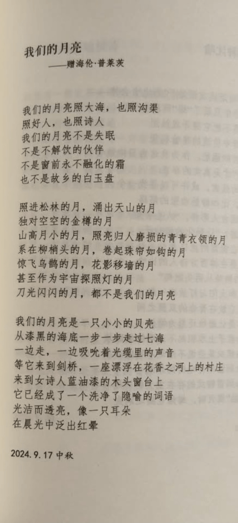 ‘Our Own Moon’—to Helen Pletts 海伦·普莱茨 by Ma Yongbo马永波, written in response to ‘the moon is the white place if the sea of poetry’ by Helen Pletts 海伦·普莱茨 to Ma Yongbo 马永波