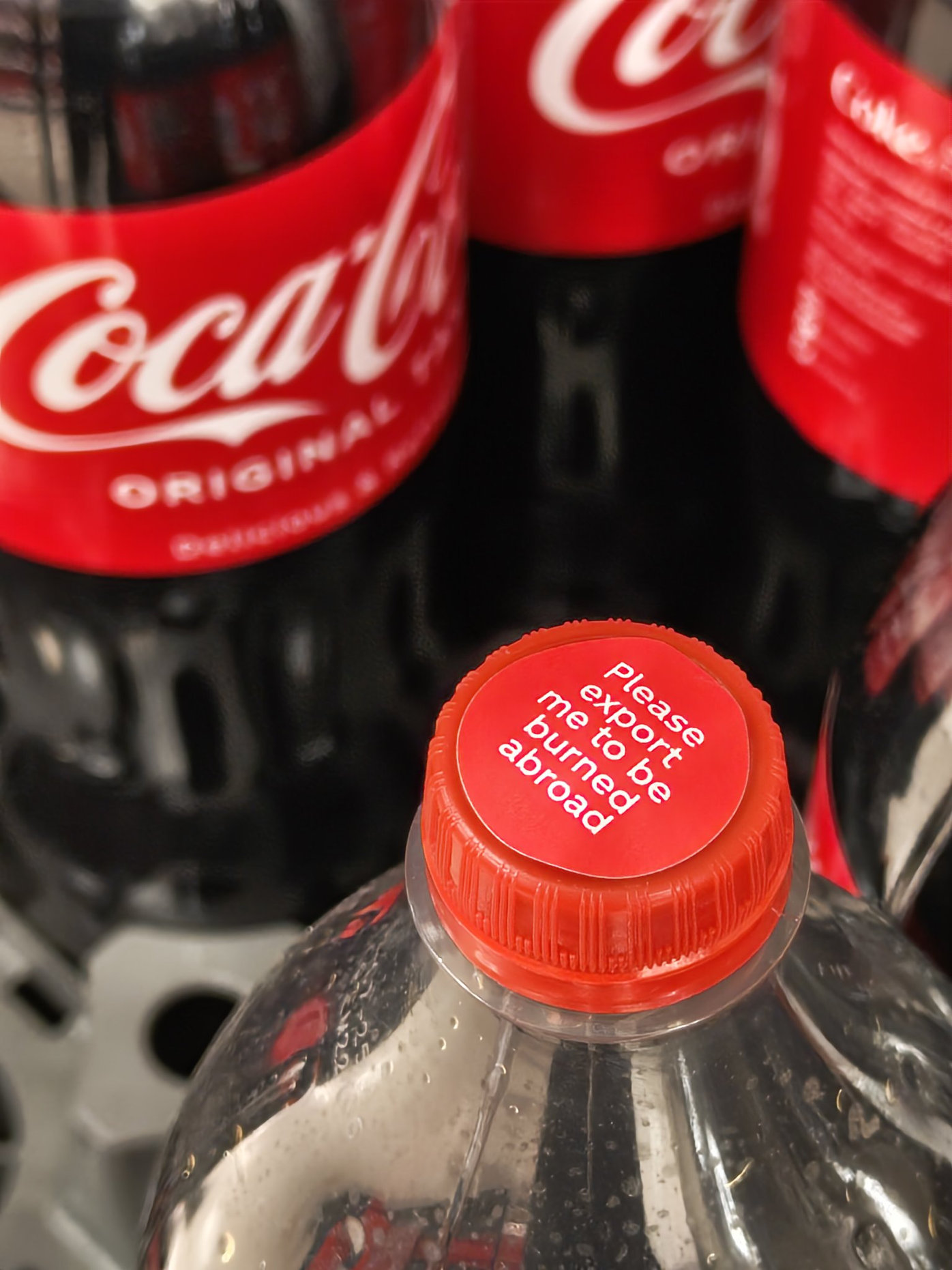 Coca-Cola is the world’s largest plastic polluting company and over half of UK plastic “recycling” is exported to be burned or dumped abroad.