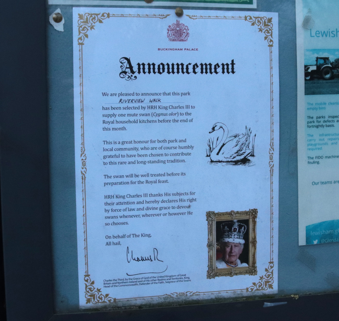Announcements from Buckingham Palace have started appearing in parks around London. He must be preparing for a big feast!