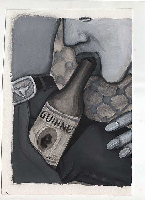 When I came to I felt like a Breugel, lithe and prostrate. Nice helped me to my feet and there I stood, staring at a moving daguerreotype of affection. She placed beer in hand and I managed to rig a second-nature, necessity-determined, physics-enhanced feeding crane: my right arm reached across solar plexus, clung to an anchoring fold of flesh under crux of left armpit, upon which my left elbow could rest; this allowed my left hand (holding beer) to pivot like a metronome toward and away from my mouth so that the feeding of “sudstenance” could remain intimately linked to essential breathing patterns.