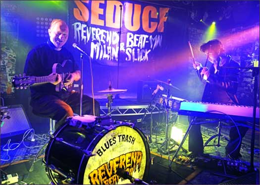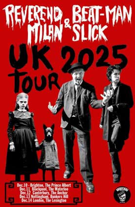 Beat Zeller, better known as Reverend Beat-Man, is a Swiss musician, DJ and record company owner. He has been performing as a one-man band (since 1992), as the leader of psychobilly band, The Monsters, and with other bands, in a style described as primitive rock ‘n’ roll, perhaps more aptly known as ‘gospel blues trash’. And in recent times, he has teamed up with the louche, Milan Slick…he of the Nick Cave style and looks!