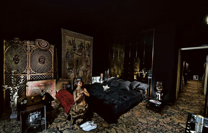 Lastly, I arrive at the bedroom where Serge died in his sleep in 1991. The heavily black velvet clad room has a decorative screen and an ornate Baroque bench carved in the shape of a mermaid reclines at the end of the low, wide bed. This is where his body was embalmed so his family and friends could spend more time with him. Being close to his cold, dead body was better than not having him there at all, Charlotte says.
