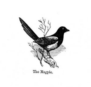 This folksong has its origins in ornithomancy – the ancient practice of interpreting omens from bird behaviour – superstitions connected with magpies, considered a bird of ill omen in some cultures and in Britain. Many sources claim that the earliest recorded version of the rhyme appeared in 1777 in a note within John Brand’s Observations on Popular Antiquities of Great Britain. The Origin of our Vulgar and Provincial Customs, Ceremonies, and Superstitions. However, the claim that Brand’s 1777 work contains the magpie rhyme is incorrect. While the book does describe the chatter of the mag-pye as an omen of dire calamity or great misfortune, there is no recorded version of the rhyme itself. The rhyme was first recorded in Samuel Johnson and George Steevens’s 1780 supplement to their 1778 edition of The Plays of William Shakespeare. ‘The magpie is called in the west to this hour, a magatipie, and the import of the augury is determined by the number of these birds that are seen together’.